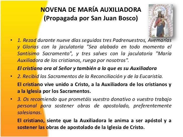 La santa virgen maría auxiliadora es una de las advocaciones con las que se conoce a la madre de jesús que se ha manifestado en la tierra. Querido san josé, gracias por ser padre y protector del niño jesús, te pedimos que ruegues a dios por nosotros para que seamos una familia unida en el amor y podamos ser ejemplo de paz y reconciliación para los demás. Aceptad esta humilde oferta vos que siempre habéis sido la auxiliadora del pueblo cristiano. Oh madre nuestra auxiliadora, oh purísima, dulce y bella virgen maría, que con amor despliegas tus favores hacia nosotros y dia. A vos lo consagro y quiero que sea siempre vuestro y de vuestro hijo jesús.