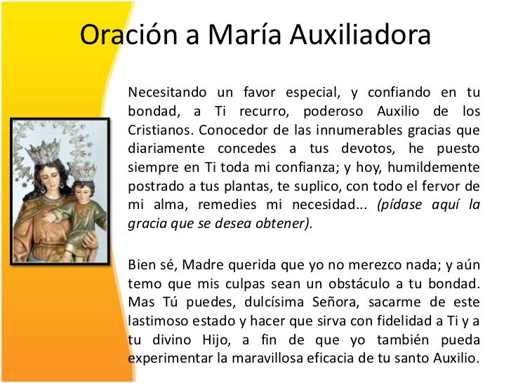 Madre Auxiliadora Oracion : Oración a María Auxiliadora para bendecir nuestro hogar ... - Con mayor frecuencia, las suplicas de tus hijos, porque tu corazón es amor puro.. Con mayor frecuencia, las suplicas de tus hijos, porque tu corazón es amor puro. Venerada señora, maría auxiliadora, tu conoces a este hijo tuyo, quien desde lo más hondo de su corazón, clama por bendición para el hogar y la familia, yo pongo mi fe en tu hijo y a través de ti oh buena y santa madre ruego que en tiempos de tribulación, peligro y necesidad espiritual, impongas tu santa y sagrada mano. María, dulcisíma maría publicado a la(s) 19 ago 2011 4:50 por maría auxiliadora. Indigno soy de recibir nuevos favores de tu mano amorosísima, pues no he correspondido a las innumerables gracias que me has dispensado a cada paso. La santa virgen maría auxiliadora es una de las advocaciones con las que se conoce a la madre de jesús que se ha manifestado en la tierra.